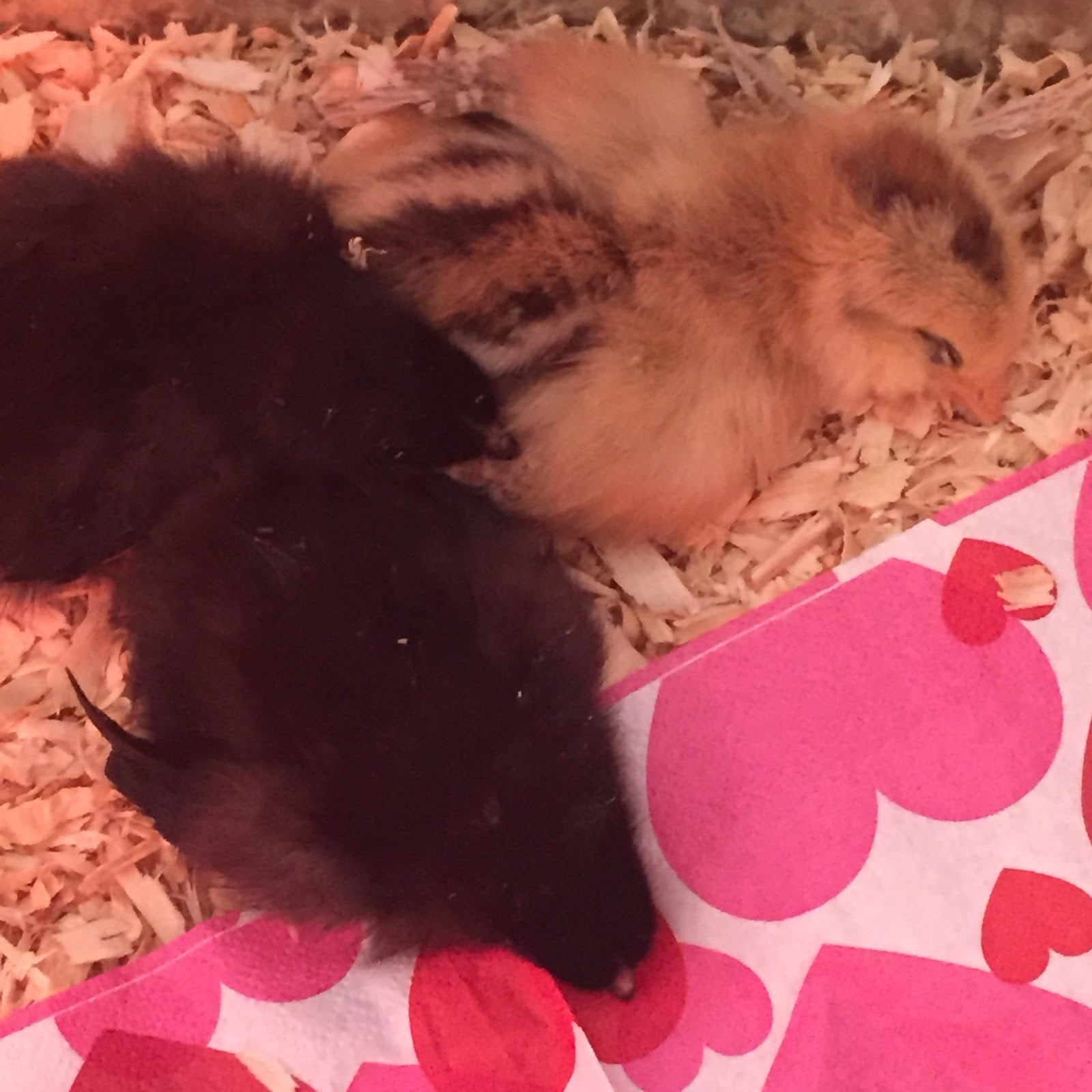 Heat lamps are a must, but be careful! The brooder temperature should be 95 degrees F for the first week of life. Heat lamps with a red bulb are best. They discourage the chicks from pecking each other. Chicks will peck at anything that looks even slightly out of the ordinary, but especially red. The idea with the red bulb is that it makes everything look red. The temperature can be dropped 5 degrees F each week until the brooder reaches ambient temperature. The chicks must be able get away from the heat lamp if they are too hot. They can die if they get overheated. Also, it's not a good idea to keep the feed or water too close to the heat lamp. If the chicks are all huddled together shivering under the heat lamp your brooder is probably not warm enough. Conversely if they are all huddled at the furthest corner away from the heat lamp it is probably too hot. You should see them freely walking around, not too clustered, with some of them enjoying the heat of the lamp, some of them scratching around and some of them at the waterer and feeder station. The one exception I noticed to this was at night when they were all sleeping. They'd form little rows and dog piles of happy sleeping chicks, one of my favorite sights!