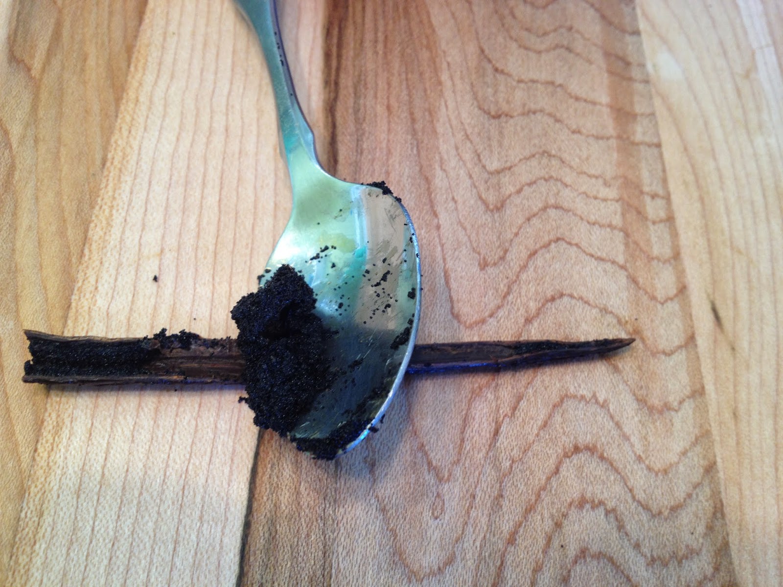 1. The first step is to slice your vanilla beans longwise and remove the "caviar". This can be done by using the tip of your knife or a spoon.
